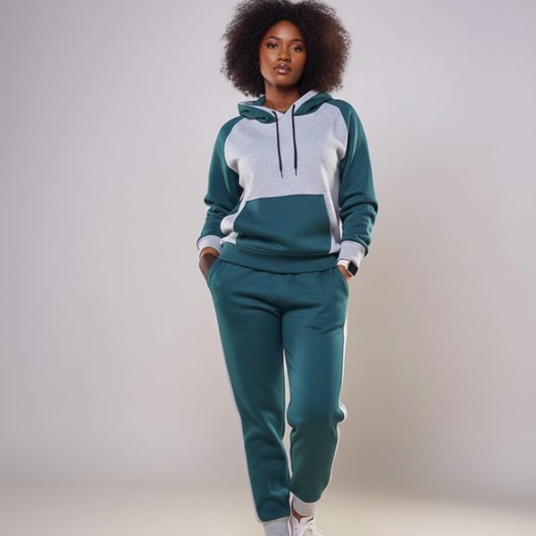 The bangi tracksuit come in a pine green and light grey blend colour with light grey stripes on both sides of the pants and a small grey touch on the head hoodie with black strings, The arms have a small light grey finishing stopper to blend with both the hoodie and sweatpants
