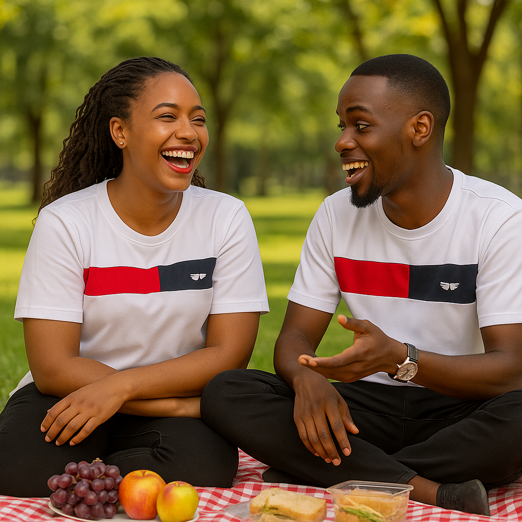 This is one of our best selling item called the danzle wear. it comes in couple T shirts white in colour, round neck with colour block lines in red and navy blue runinng from left to right of the upper front of the T-shirt