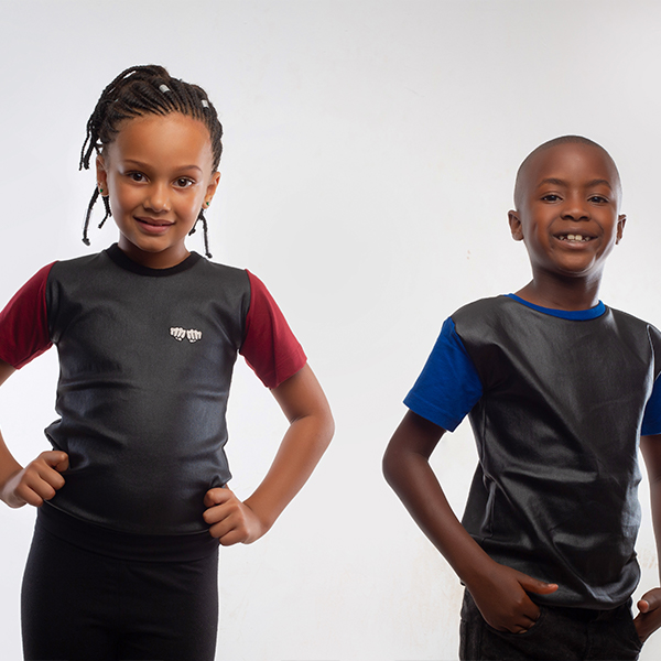 The maroon short sleeve match with the maroon neck on the black leather body for the girl and Royal blue short sleeve and neck matching on the black leather body.