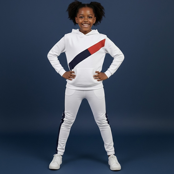 The wenzi track suits in white and colour block navy blue red on the hoodie and navy blue stripes on the both sides of the sweatpants. this is premium unisex hoodie and sweatpants sweat-able for leisure days, just the right fit from krump Ug clothing.