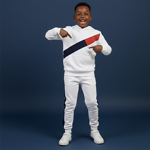 The wenzi track suits in white and colour block navy blue red on the hoodie and navy blue stripes on the both sides of the sweatpants. this is premium unisex hoodie and sweatpants sweat-able for leisure days, just the right fit from krump Ug clothing.