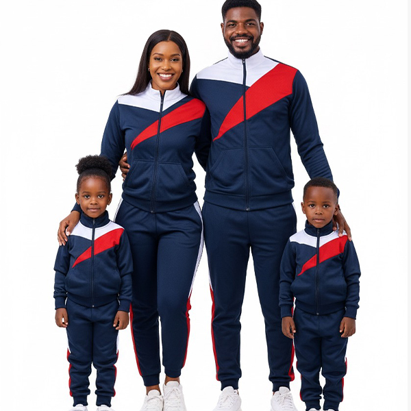 The Fex unisex tracksuits come with navy blue main colour with colour block white and red blend, the are open zipper with. short neck and long sleeve arms, The pants have a main colour as navy blue with red stripes on both sides of the pants to compliment the top blend. This family pack comes in all sizes and for all ages